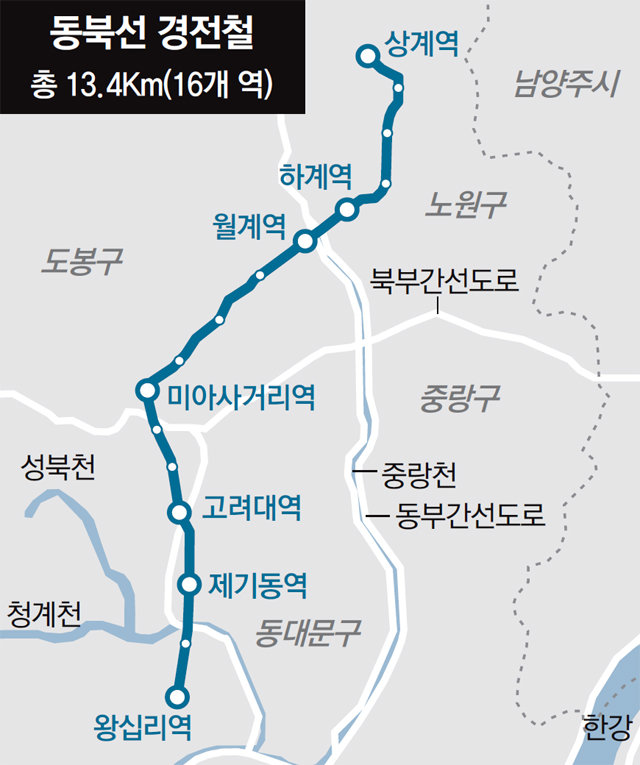 동북선은 왕십리역∼제기동역∼고려대역∼미아사거리역∼월계역∼하계역∼상계역으로 이어지는 13.4km 구간의 도시철도다. 정거장은 16개다. 개통되면 상계역에서 왕십리역까지 25분이 걸릴 것으로 예상된다. 현재 4호선과 2호선을 이용하는 것보다 12분 단축되는 것이다. 지하철 1·2·4·5·6·7호선과 경원선, 분당선, 경의중앙선 등 모두 9개 노선과 이어져 시민들의 편의성이 높아질 것으로 기대된다.