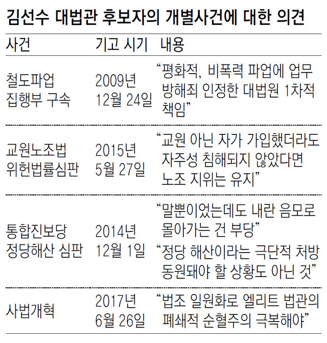 ‘민주사회를 위한 변호사모임(민변)’ 창립 회원이자 회장을 지낸 김선수 대법관 후보자(57·사법연수원 17기)는 평소 언론 기고를 통해 각종 현안에 대해 자신의 의견을 적극적으로 드러냈다. 동아일보가 5일 김 후보자의 글을 사안별로 분석한 결과 기존 대법원 판례나 헌법재판소 결정과는 다른 생각을 갖고 있는 것이 그대로 나타났다.