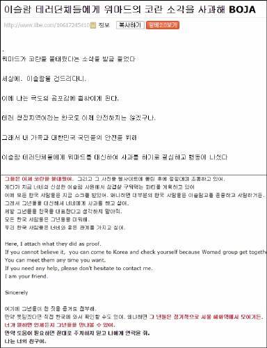 해당 일베의 회원은 12일 게시판에 “내 가족과 대한민국 국민들의 안전을 위해 이슬람 테러단체들에게 워마드를 대신하여 사과를 하기로 결심하고 행동에 나섰다”는 내용의 글을 올렸다.