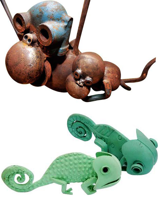 ‘반쪽이의 육아일기’란 책을 쓴 최정현 작가는 오토바이 부품으로 만든 독수리, 다리미를 활용한 펠리컨 등을 출품했다. 그는 동식물 외에 볼펜과 화장실용 ‘뚫어뻥’으로 한국 정치를 풍자한 ‘국회의사당’, 인터넷 익명성의 병폐를 다룬 ‘네티즌 시리즈’ 등의 작품도 선보인다. 전시작 중 초·중등학교 교과서에 실려 있는 작품도 있다.