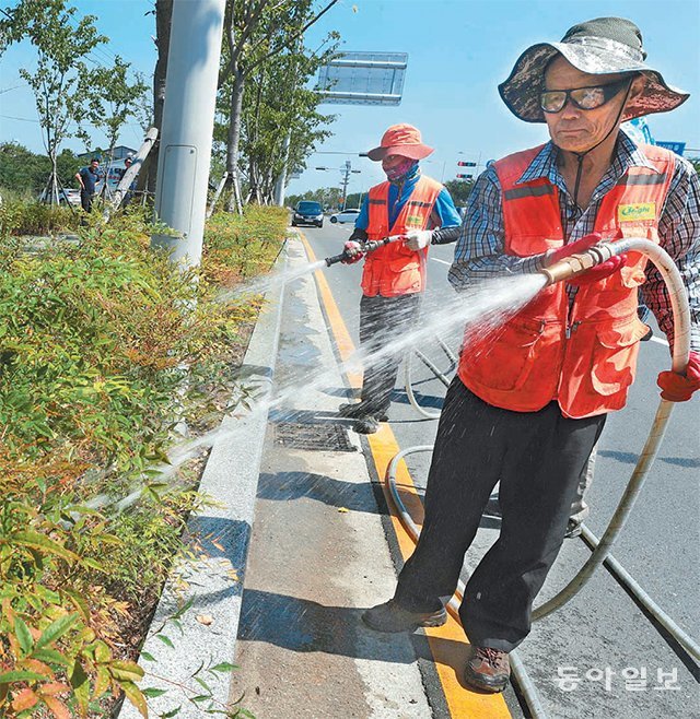 부산 경남지역에 14일째 폭염이 이어지고 있는 가운데 25일 부산 강서구청 직원들이 강서구 대저동 공항로 가로변 화단에 물을 뿌리고 있다.