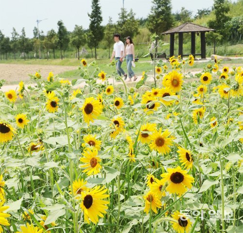 15일 부산 강서구 대저생태공원을 찾은 관광객들이 활짝 핀 해바라기밭을 산책하고 있다.
