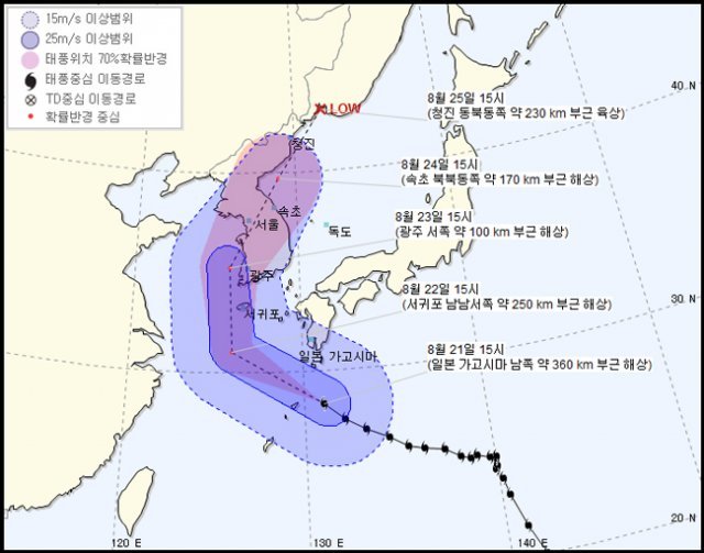 21일 기상청에 따르면 태풍 솔릭은 이날 오후 3시 현재 일본 가고시마 남쪽 약 360km부근 해상을 지나 시속23km로 북서진하고 있다. 중심기압 950헥토파스칼(hPa), 최대풍속 43m/s, 강풍반경 380km의 ‘강한’ 중형 태풍이다.