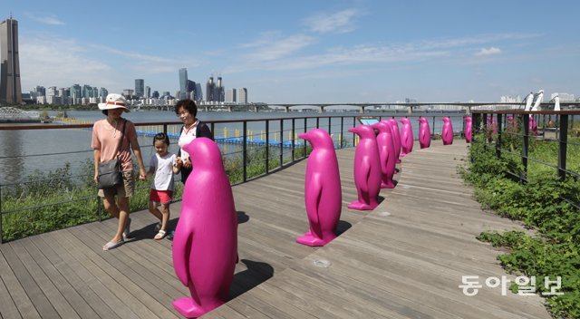 서울시는 이촌한강공원과 여의도한강공원에 예술 작품 37점을 설치한 한강예술공원을 25일 열었다. 한 가족이 26일 용산구 이촌한강공원에 설치된 ‘핑크 펭귄과 노랑 거대 달팽이’ 작품을 감상하고 있다.