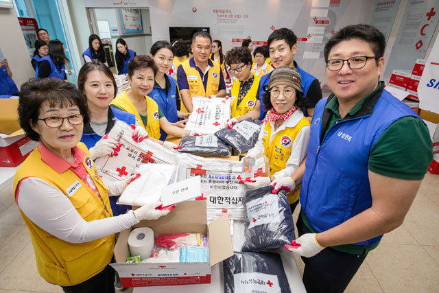 삼성전자는 6일 서울 대한적십자사 긴급구호종합센터에서 태풍, 수해 등 재난에 대비해 담요와 구호 의류 등 5억 원 상당의 긴급구호품 6373세트를 전달했다. 삼성전자 임직원들이 이날 직접 포장한 긴급구호품은 전국 대한적십자사 15개 지사에 분산 비축돼 재난재해 발생 시 사용될 예정이다.