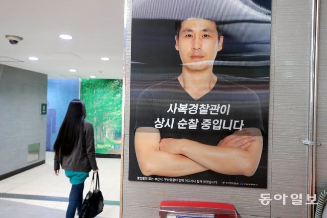 9일 부산 해운대전철역 화장실 입구에 부산지방경찰청에서 제작한 불법촬영 근절을 위한 포스터가 붙어 있다. 포스터는 ‘불법촬영 예방을 위해 사복경찰관이 상시 순찰 중입니다’를 슬로건으로 경고 메시지를 담았다.