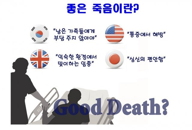 미국에서는 좋은 죽음에 대해 ‘통증으로부터 해방’, ’영적인 평화‘, ’가족이 함께 있는 것‘ 등의 순으로 높게 나왔다.