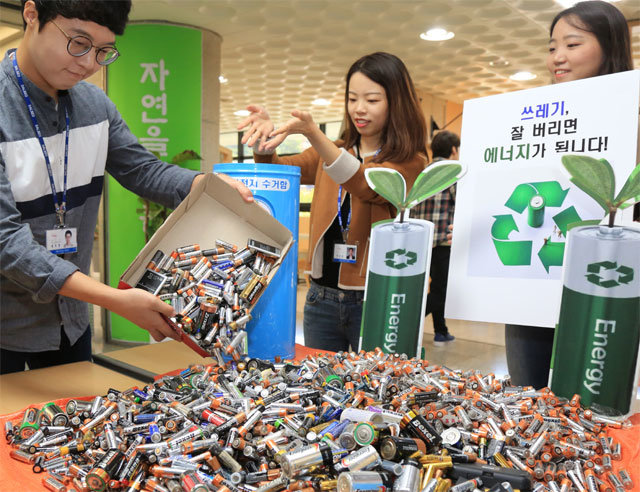 대구 달서구는 연말까지 폐건전지 모으기 운동에 나선다. 최근 달서구청 대강당에서 열린 월례모임에 참석한 직원들이 폐건전지를 모으고 있다.