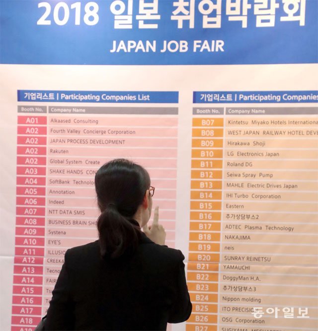 5일 부산 해운대구 벡스코에서 열린 ‘2018 일본 취업박람회’에서 한 구직자가 채용정보를 살펴보고 있다. 고용노동부, KOTRA, 한국산업인력공단이 공동 주최하는 이번 행사에는 소프트뱅크와 닛산자동차를 포함한 일본 기업 112곳이 참가해 700여 명을 채용할 예정이다. 일본 취업박람회는 7일에는 서울 송파구 롯데호텔월드에서도 열린다.