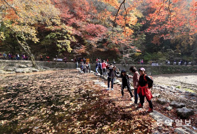 단풍이 막바지에 접어든 13일 단풍 명소 가운데 하나로 꼽히는 전남 장성 백양사를 찾은 관광객들이 어린아이 손처럼 작고 곱게 물든 단풍을 보며 늦가을을 즐기고 있다.