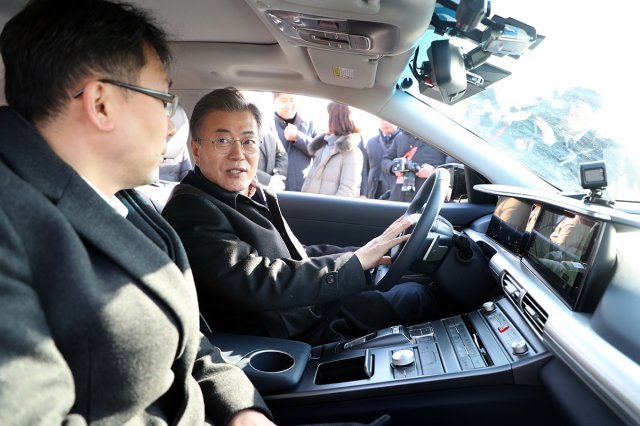 문재인 대통령. 사진은 지난 2월 서울 서초구 만남의광장 휴게소에서 신형 수소 자율차량인 넥쏘에 오른 모습. (청와대 제공)