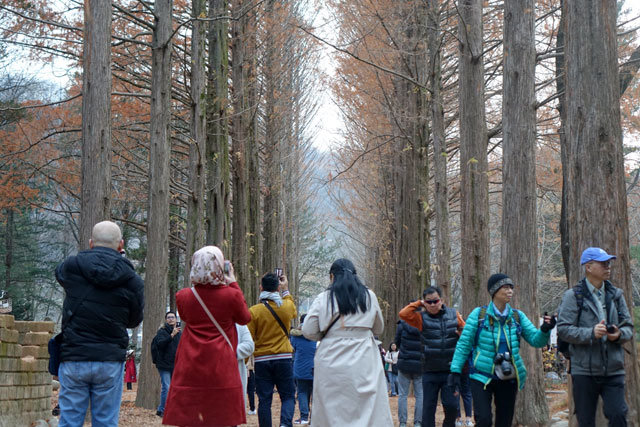 17일 강원 춘천시 남이섬 메타세쿼이아길에서 외국인 관광객들이 사진을 찍으며 늦가을 정취를 즐기고 있다. 11월의 남이섬은 땅에 쌓인 낙엽과 운치 있는 메타세쿼이아길이 돋보인다.