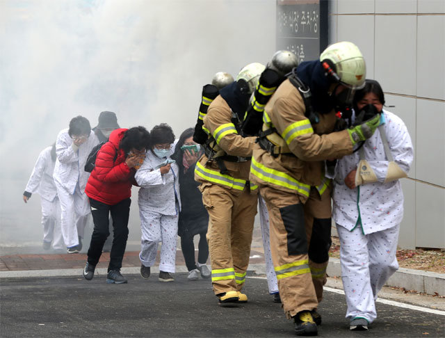 27일 서울 중랑구 신내동 서울의료원에서 화재 대피 훈련에 참가한 시민들이 마스크와 손수건 등으로 입을 가린 채 건물 밖으로 대피하고 있다. 이날 훈련은 제409차 민방위의 날을 맞아 오후 2시부터 20분간 전국 968개 사업장에서 일제히 열렸다.