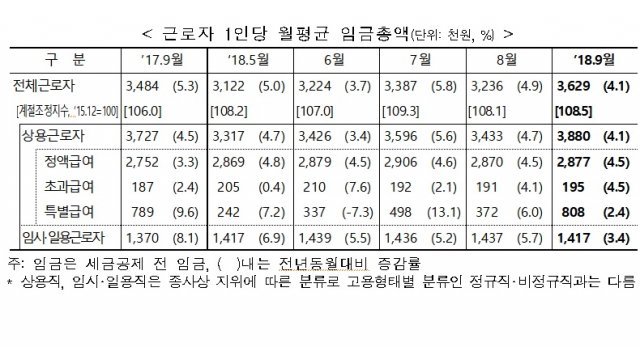 사업체노동력조사의 월평균 임금총액은 정액급여·초과급여·특별급여를 모두 포함하는 세금공제전 금액이다.정액급여는 근로계약, 단체협약 또는 취업규칙 등으로 소정근로시간에 대해 미리 정한 기본급과 통상적 수당, 기타수당(연차수당, 정근수당 포함)으로 지급한 총액을 말한다.