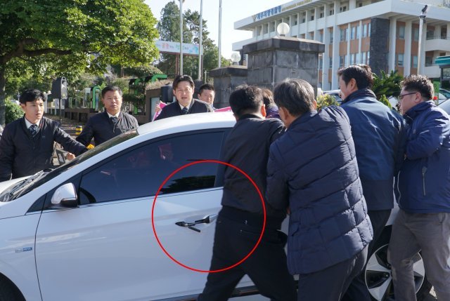 5일 낮 12시쯤 제주도청 정문에서 ‘’의료영리화저지와 의료공공성강화를 위한 제주도민운동본부‘’회원들이 원희룡 제주도지사가 탄 차량을 막아서며 영리병원 허용 반대를 외치고 있다. 제주도는 이날 오후 2시 전국 첫 영리병원인 녹지국제병원 개원 허가 여부를 발표할 예정이다.(독자 제공) 2018.12.5/뉴스1