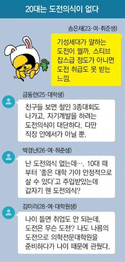 취재팀은 기성세대가 20대를 바라보는 대표적인 프레임 7개를 골라 20대들에게 의견을 물었다. 이들의 목소리를 있는 그대로 전하기 위해 카카오톡 대화 형식으로 재구성했다.