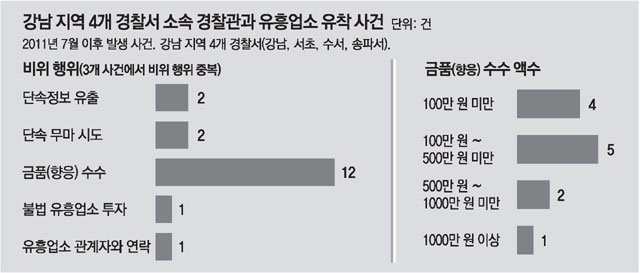 하지만 이 같은 조치 이후로도 경찰과 유흥업소 간의 유착 비리는 근절되지 않았다. 본보가 2011년 7월 ‘강남서 물갈이 인사’ 이후 발생한 강남지역 4개 경찰서(강남·서초·수서·송파서) 직원과 업소 측 간의 유착비리 관련 판결문 15건과 징계기록을 입수해 분석한 결과다. 사건에 연루된 경찰 15명이 징계를 받았고 이 중 8명은 뇌물수수 등의 혐의로 유죄 판결을 선고받았다.