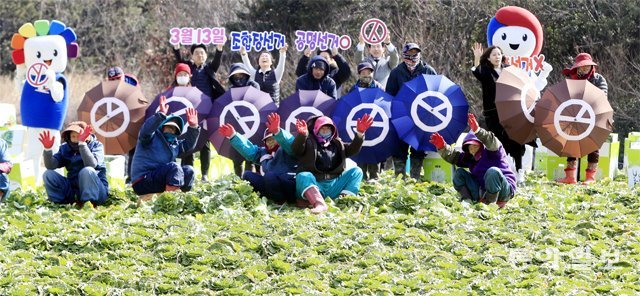 13일 치러지는 제2회 전국동시조합장선거를 앞두고 4일 전남 진도군 군내면의 배추밭에서 전남도선거관리위원회 직원들이 농민들과 함께 금품선거 없는 깨끗한 선거를 실천하자는 캠페인을 벌이고 있다.