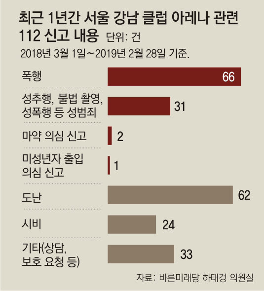 경찰이 서울시내 클럽 내에서의 마약 투약과 유통, 성폭행 의혹 등에 대해 수사를 벌이고 있는 가운데 아레나 내부에 CCTV가 한 대도 설치돼 있지 않아 범죄의 사각지대가 되고 있다는 지적이 나온다. 서울지방경찰청이 바른미래당 하태경의원실에 제출한 자료에 따르면 최근 1년간 아레나 관련 112 신고는 모두 219건으로 폭행 66건, 성추행·불법 촬영·성폭력을 비롯한 성범죄 사건 31건, 마약 의심 신고 2건 등이었다. 하지만 이 가운데 현행범 체포로 이어진 건 7건뿐이다.