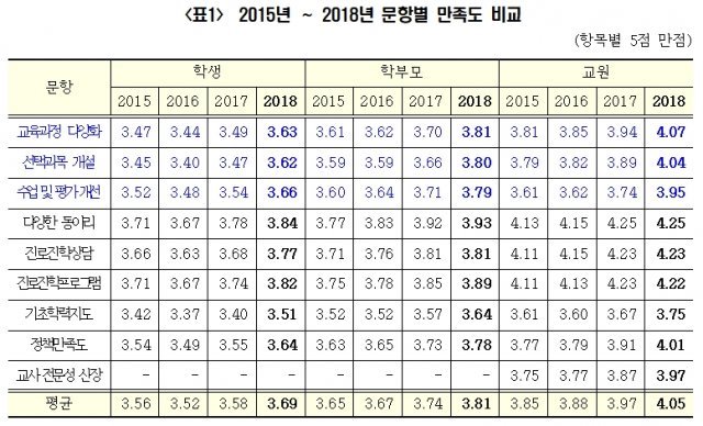 일반고 학생 1만7843명과 학부모 8994명, 교사 1만155명 대상으로 실시한 이 조사 결과에 따르면 만족도는 5점 만점에 학생은 3.69점, 학부모는 3.81점, 교사는 4.05점으로 나타났다. 이는 전년도보다 각각 학생 0.11점, 학부모 0.07점, 교사 0.08점 상승한 점수다.