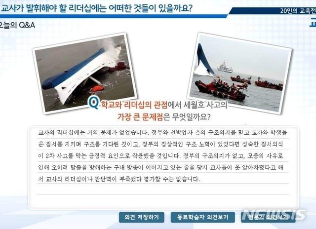 이에 대해 이 과정을 연수중인 한 교육전문직 관계자는 “정부와 선박업자 측의 구조의지를 믿고 교사와 학생들은 질서를 지키며 구조를 기다린 교사의 리더십에는 거의 문제가 없었다”며 “오히려 탈출을 방해하는 구내방송이 이어지는 것을 당시 교사들이 못 알아차렸다고 해서 교사의 리더십이나 판단력이 부족했다 평가할 수 없다”고 지적했다.