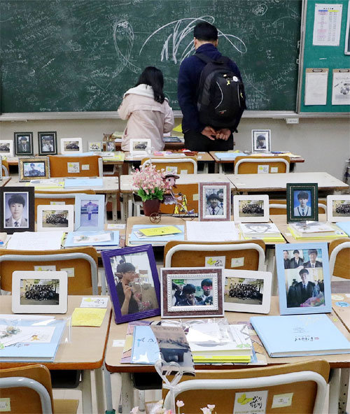 세월호 참사 5주기를 하루 앞둔 15일 경기 안산시 안산교육지원청의 ‘단원고 4·16 기억교실’. 참사로 희생된 단원고 2학년 학생들이 공부했던 교실을 재현한 곳이다. 5주기 기억식은 16일 오후 3시 안산시 화랑유원지에서 거행된다.