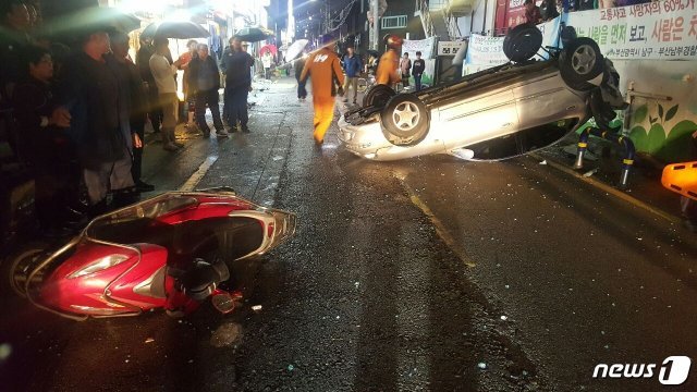 23일 오후 8시2분쯤 부산 남구 문현동의 한 대형마트 앞 도로에서 술에 취해 아반떼를 몰고가던 운전자 A씨(56·여)가 지나가던 인피니티와 말리부를 들이받고 인근 횟집으로 돌진했다가 주차된 오토바이와 보행자까지 충격하는 사고가 났다. 사고 현장에서 아반떼가 전복된 모습.(부산지방경찰청 제공)
