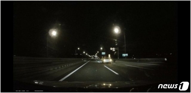 인터넷 커뮤니티에 올라온 인천고속도로 사고 전 블랙박스 영상. 한지성씨가 차 뒤에서 허리를 숙이고 있는 모습이 담겨있다.(인터넷 커뮤니티 캡처)© 뉴스1