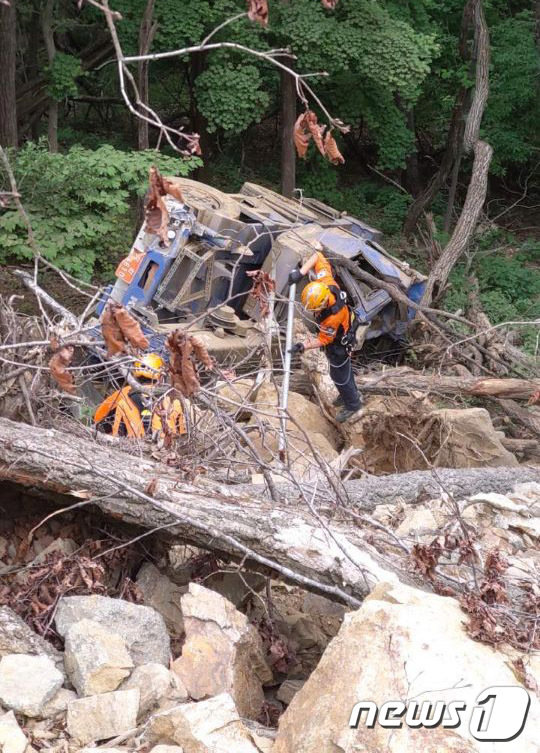 17일 오후 2시57분쯤 강원 고성군 수동면 사천리 야산에서 크레인 작업을 하던 안모씨(38)가 20m 아래로 떨어진 사고현장. 소방대원이 구조작업을 하고 있다. (인제소방서 제공) 2019.5.17/뉴스1 © News1
