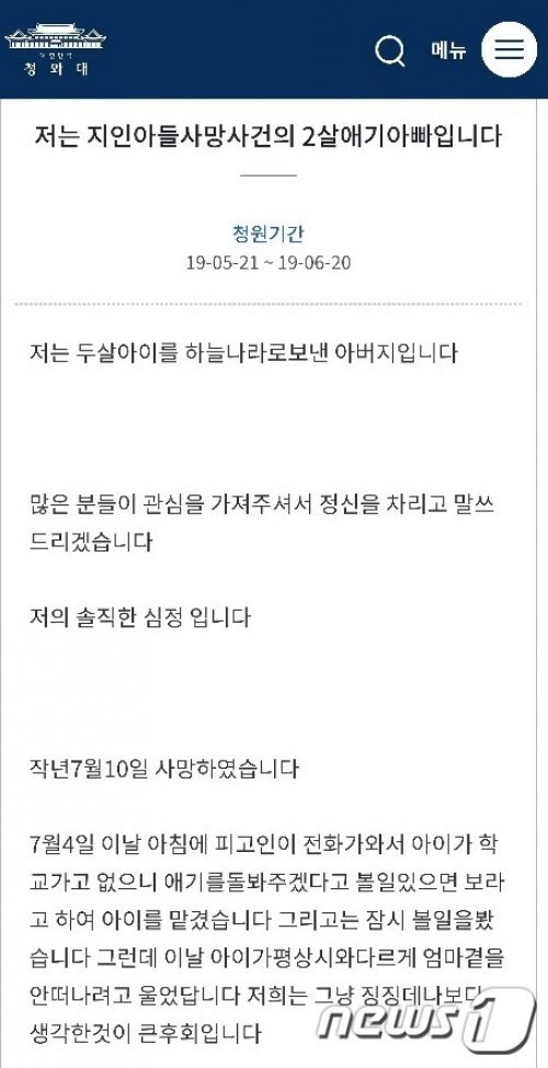 또 그는 이날 청와대 국민청원 게시판에 ‘지인 아들 사망사건의 2살 애기 아빠입니다’라는 제목의 청원글도 올렸다.