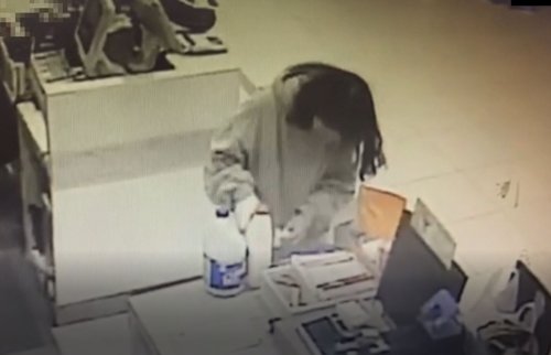 고유정 씨가 환불하려고 내놓은 표백제 통 겉을 닦고 있다./ 제주동부경찰서 공개 폐쇄회로(CC)TV 영상 일부. 장연제 동아닷컴 기자 jeje@donga.com
