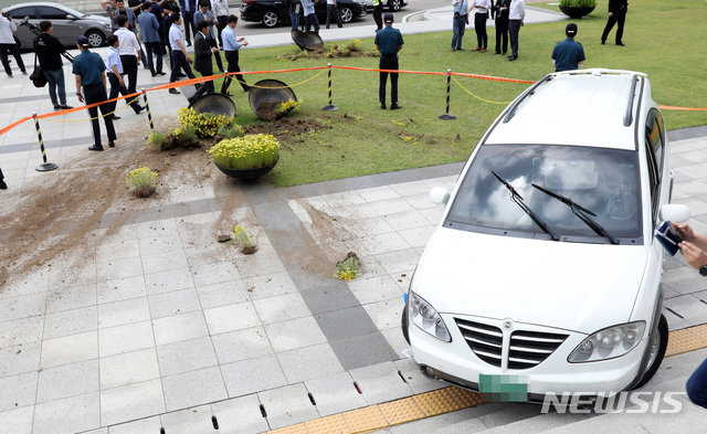 A씨가 몰고온 로디우스 차량은 계단을 올라가지는 못했으나, 본관 앞 화단과 화분을 훼손했다.