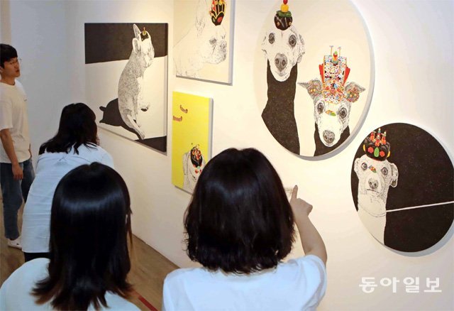 관람객들이 9일 부산 동구 부산시민회관 갤러리에서 열린 반려동물전을 둘러보고 있다. 다음 달 25일까지 진행되는 이번 전시에는 미술작가 20인이 참여해 유기견 문제 및 동물 학대 등 사회적 이슈를 예술로 표현했다.