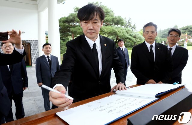 조국 신임 법무부 장관이 9월10일 오전 서울 동작동 국립서울현충원 참배를 마친 뒤 ‘국민으로부터 받은 권한, 국민께 돌려드리기 위하여 법무부 혁신과 검찰개혁을 완수하는데 최선을 다하겠습니다’라고 방명록에 적고 있다. © News1