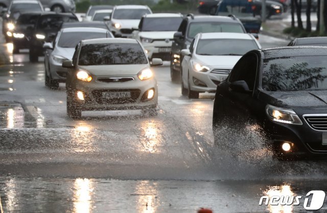 제18호 태풍 ‘미탁’(MITAG)이 북상하며 울산지역에 호우주의보가 발효된 2일 오전 울산시 남구 한 도로에서 차량들이 전조등을 켠 채 서행하고 있다. 2019.10.2/뉴스1 © News1