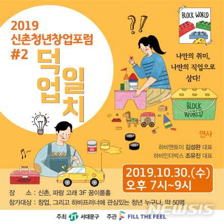 서울 서대문구(구청장 문석진)는 30일 오후 7시 신촌 도시재생 앵커시설인 ‘신촌, 파랑고래’ 3층 꿈이룸홀에서 덕업일치란 제목으로 ‘신촌 청년창업포럼’을 연다고 23일 밝혔다.