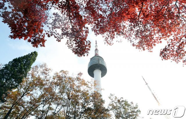 전국이 대체로 맑고 선선한 가을 날씨를 보인 27일 서울 중구 N서울타워에서 바라본 남산에 단풍이 울긋불긋 물들어 있다. 2019.10.27/뉴스1 © News1