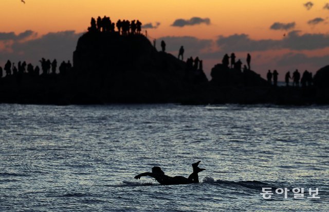 바위 위에 오른 사람들보다 더 마음 급한 서퍼들이 바다 한가운데로 향합니다. 새해 일출을 바다 위에서 온몸으로 맞이하다니 너무 멋져보였습니다.