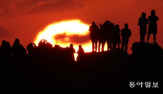 수평선에 구름이 낮게 깔려 예상시간보다 해가 늦게 떠오릅니다. 구름을 달군 붉은 빛이 설렘을 더 자극하는 효과가 있었는지 아직 해는 뜨지 않았는데도 사람들의 환호성이 길게 이어집니다.