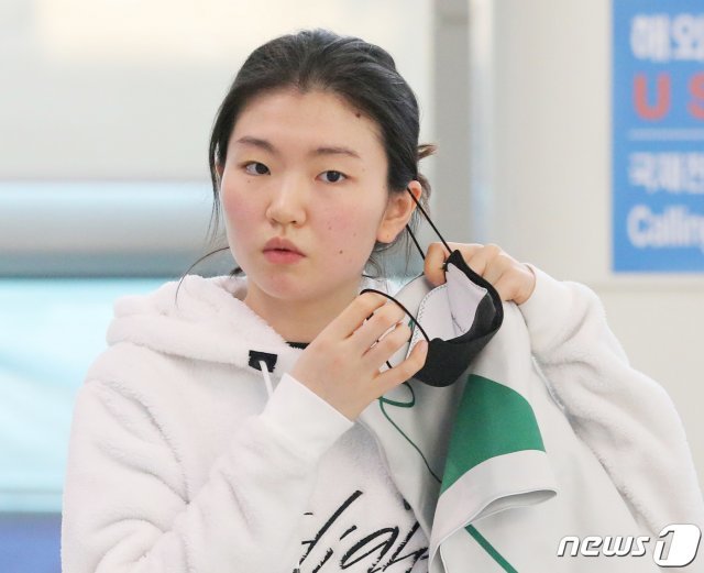 심석희 쇼트트랙 국가대표 선수가 불가리아 소피아에서 열리는 2019 세계 쇼트트랙 선수권대회에 출전하기 위해 3월3일 오전 인천국제공항을 통해 출국 전 마스크를 벗고 있다. 2019.3.3/뉴스1 © News1
