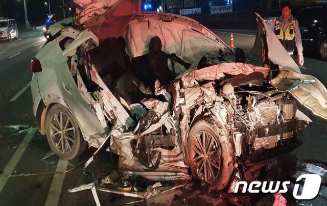 22일 오전 1시 40분쯤 경기 김포시 양촌읍 구래리의 한 4차선 도로에서 장교와 병사가 탄 SUV가 갓길에 주차된 20톤 트럭을 들이 받았다. (경기소방본부제공)2020.1.22/뉴스1 © News1
