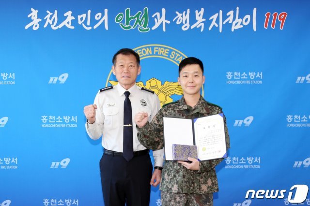 30일 오전 강원 홍천소방서에서 서무원 상사(33)가 남궁규 소방서장에게 화재진압 공로 표창을 받고 기념사진 촬영을 하고 있다. (3기갑여단 제공) © News1