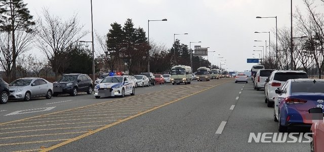 경찰은 이날 21개 중대, 2개 제대 1147명의 경력을 투입해 국가인재개발원 주변을 봉쇄했다. 격리 수용장소로 결정된 29일 300명에서 4배 가량 늘어난 규모다.