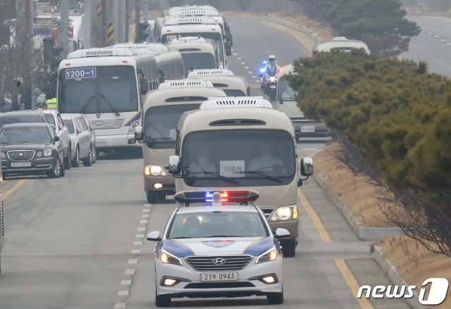 1일 오전 신종 코로나바이러스의 진원지 중국 우한에서 2차 전세기를 통해 귀국한 교민들이 탑승한 차량이 임시생활시설이 있는 충남 아산 경찰인재개발원으로 진입하고 있다. 2020.2.1/뉴스1 ⓒ News1