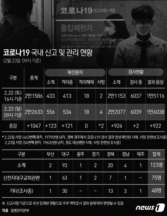 신종 코로나바이러스 감염증(코로나19) 중앙방역대책본부는 23일 오전 9시 기준 사망자 2명이 추가로 발생했다고 23일 밝혔다. 이에 따라 코로나19 누적 사망자 수는 4명으로 늘었다. 전체 사망자 4명 중 3명이 청도대남병원 입원환자였다.
