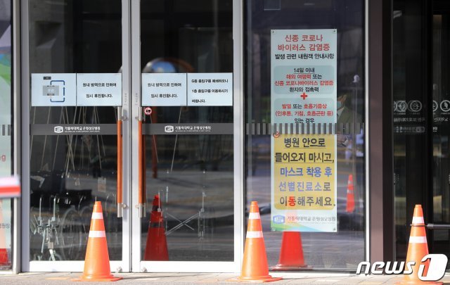 신종 코로나바이러스 감염증(코로나19) 확진자가 1천명을 넘어선 26일 서울 가톨릭대 은평성모병원이 내원객의 출입이 통제되고 있다. © News1