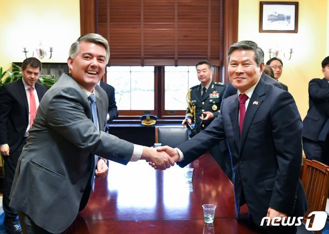 정경두 국방부장관이 25일(현지시간) 미국 의회를 방문해 코리 가드너 미국 상원 외교위 동아시아태평양 소위원장과 한반도의 완전한 비핵화와 평화정착을 위한 한미 양국 간 공조와 동맹 발전 방안에 대해 논의하기 전에 악수하고 있다. (국방부 제공) 2020.2.26/뉴스1