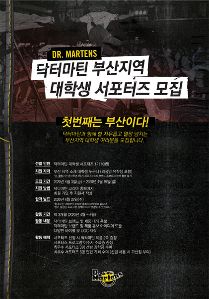 영국 패션 브랜드 닥터마틴(Dr. Martens)은 대학생 서포터즈 100명을 오는 19일까지 공식 온라인 스토어에서 모집한다고 3일 밝혔다.