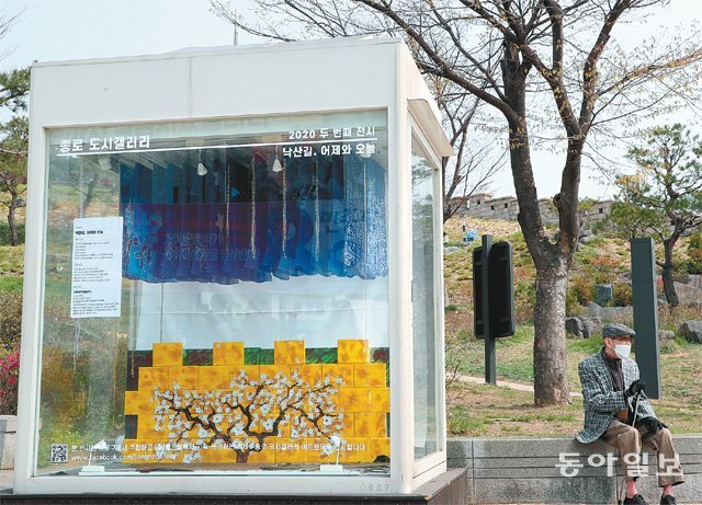 8일 서울 종로구 종로6가 흥인지문공원 광장에 설치된 한 평 남짓한 공간의 ‘종로 도시갤러리 아트윈도’. 추억이 담긴 이화벽화마을과 낙산공원 성곽길의 낮과 밤을 표현한 작품 ‘낙산길. 어제와 오늘’이 전시되고 있다.