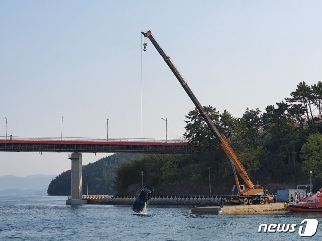 9일 오전 5시40분쯤 경남 거제시 하청면 실전항 앞바다에서 체어맨이 추락해 인양되고 있다.(창원해경 제공) 2020.4.9.© 뉴스1